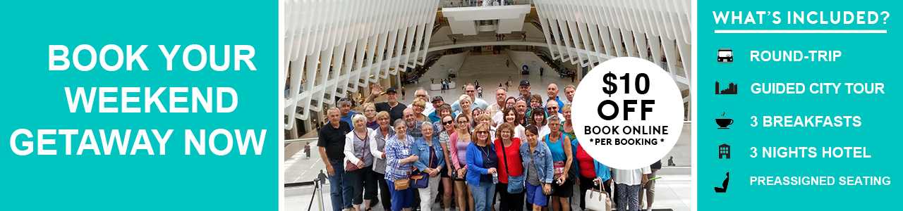 - 1:00 – 1:30 PM – Stop for lunch en route (cost of lunch is not included). Then, continue to travel through the beautiful landscapes of New York State towards your hotel accommodations.